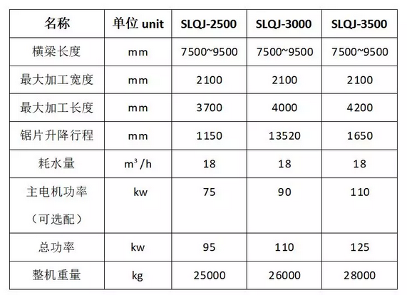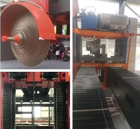 雙梁龍門切石機具有以下特點: 1. 即可掛26片塔形片,又可掛13套大小片。片數更多,產量更高。相比常規多片橋切機,可實現產量翻2-3倍; 2. 根據實際操作需要,可同時擺放2-4顆荒料進行切割; 3. 超大行程,最大可切深1.6米,在一定程度上取代框架鋸,切割成本是框架據的三分之一。投資更省,為客戶創造更高價值; 4. 采用超薄鋸片及高效節能的電機,實現了同樣產量,能耗更低,相比常規多片橋切,綜合成本可下降約30%; 5. 獨有的雙梁結構及厚重的機身,使得切割穩定性高,效果更好,精度更高,板面更平整,產量更高。
